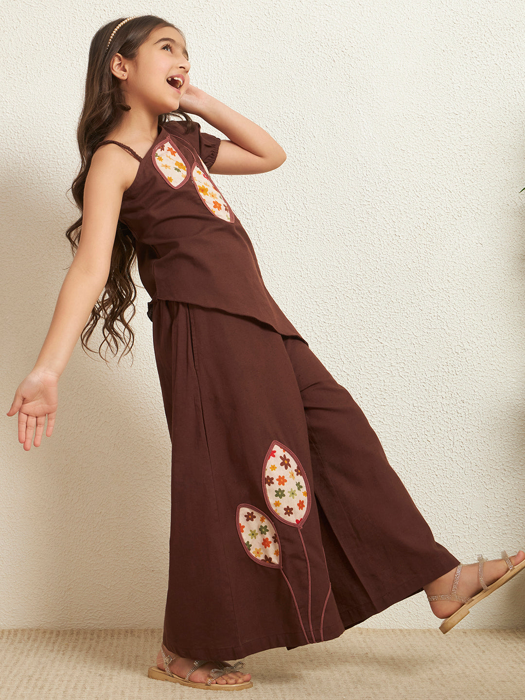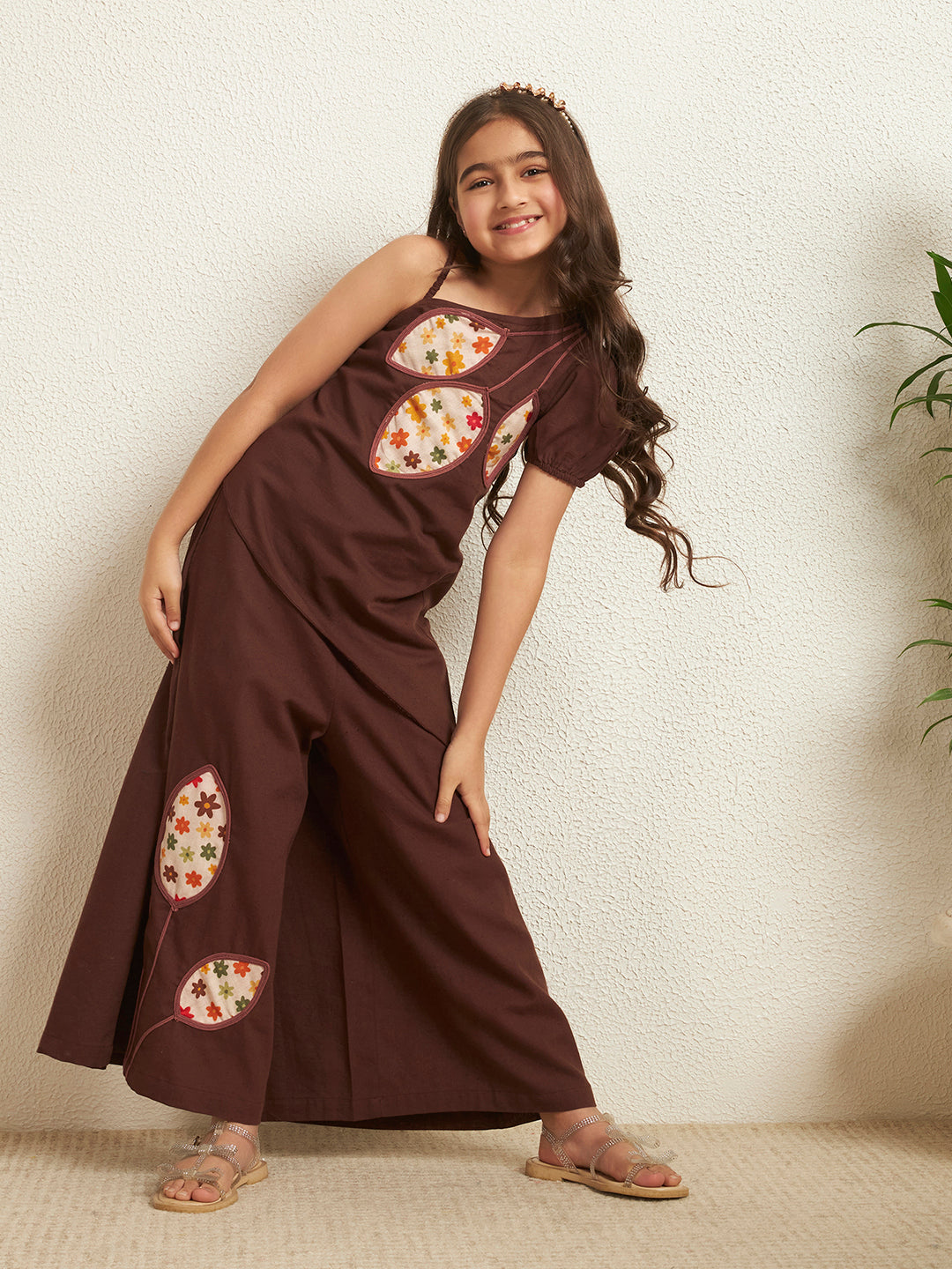 Inform when this item available Brown Cotton Flex Solid One-Shoulder Patch Work Girls Co-Ord Set