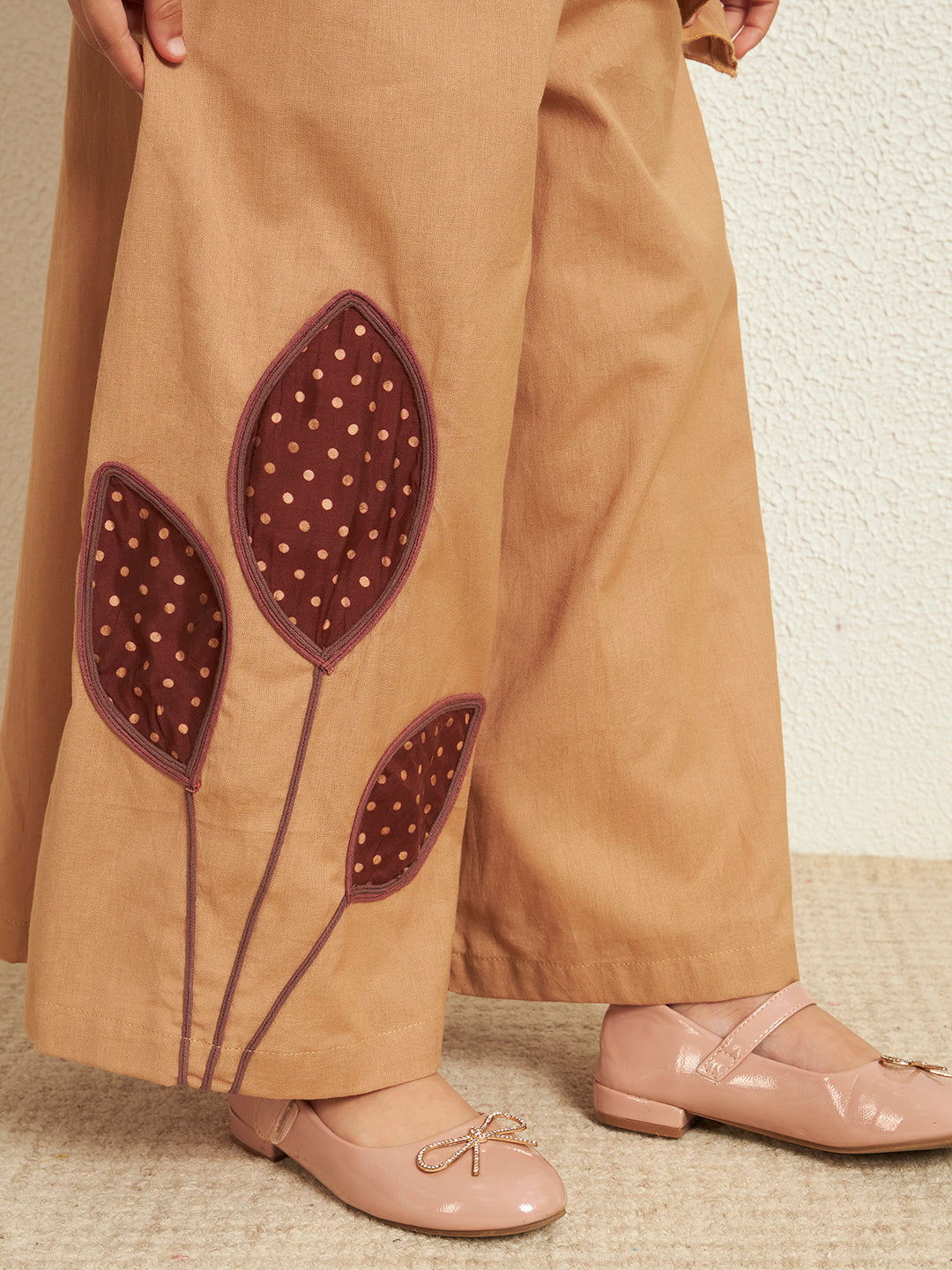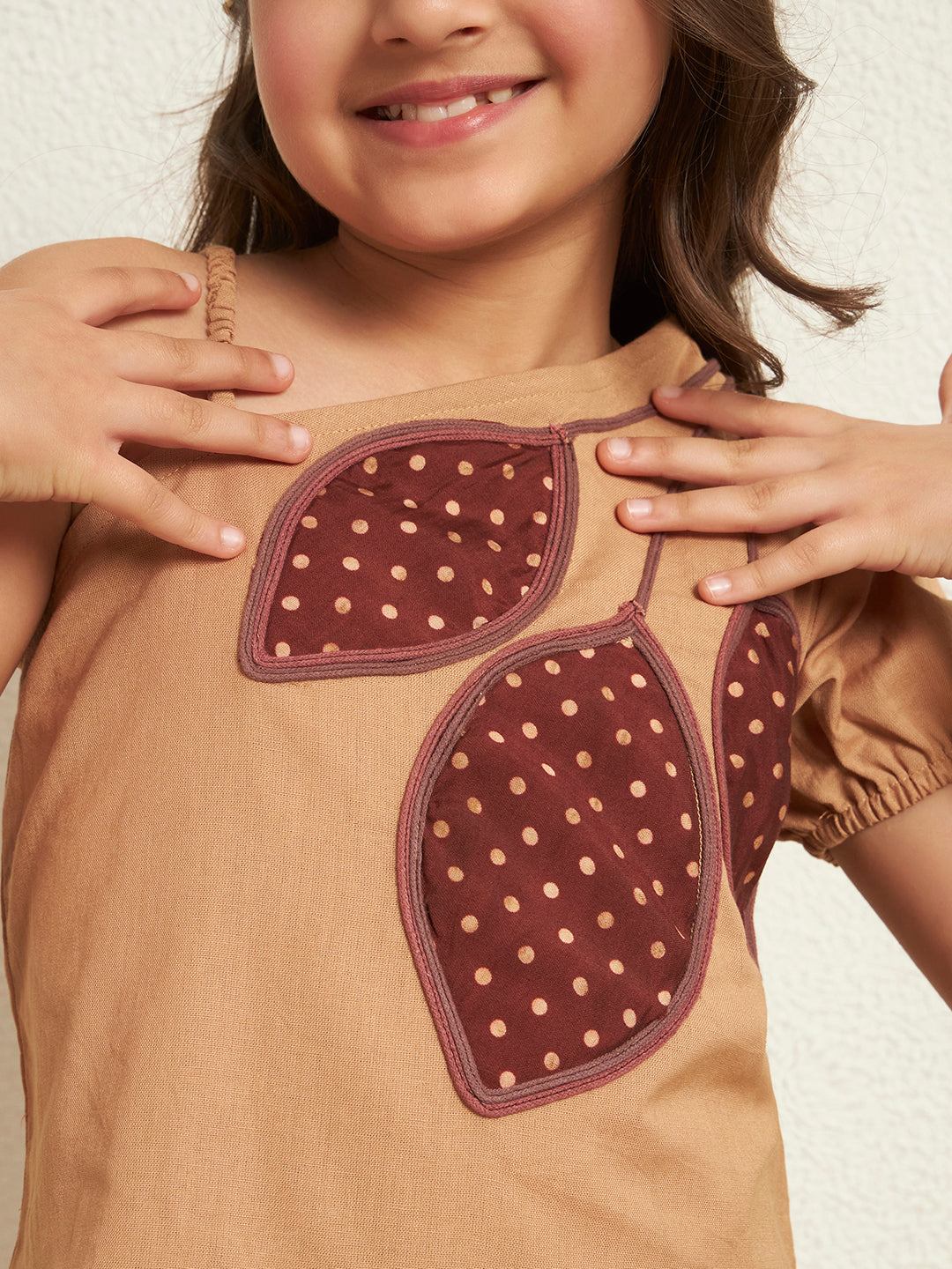 Inform when this item available Beige Cotton Flex Solid One-Shoulder Patch Work Girls Co-Ord Set