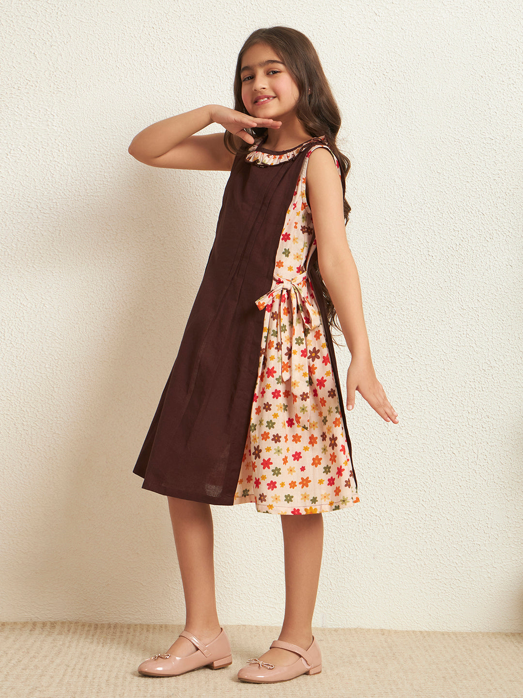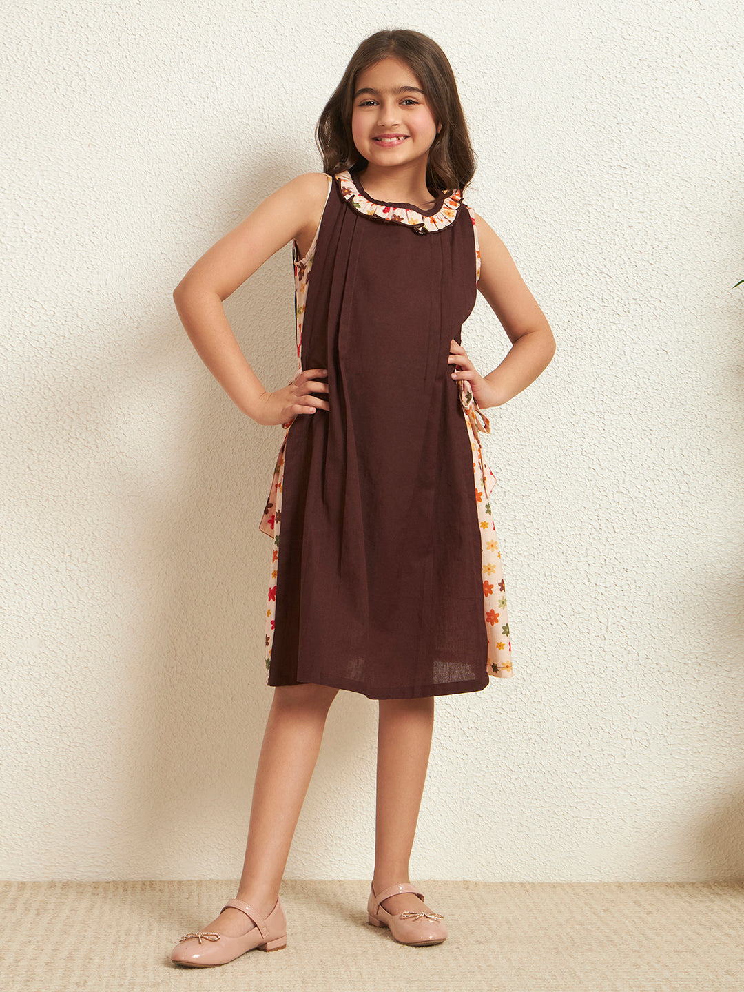 Inform when this item available Girl's Brown Cotton Flex Solid With Floral Print A-Line Tiered Dress