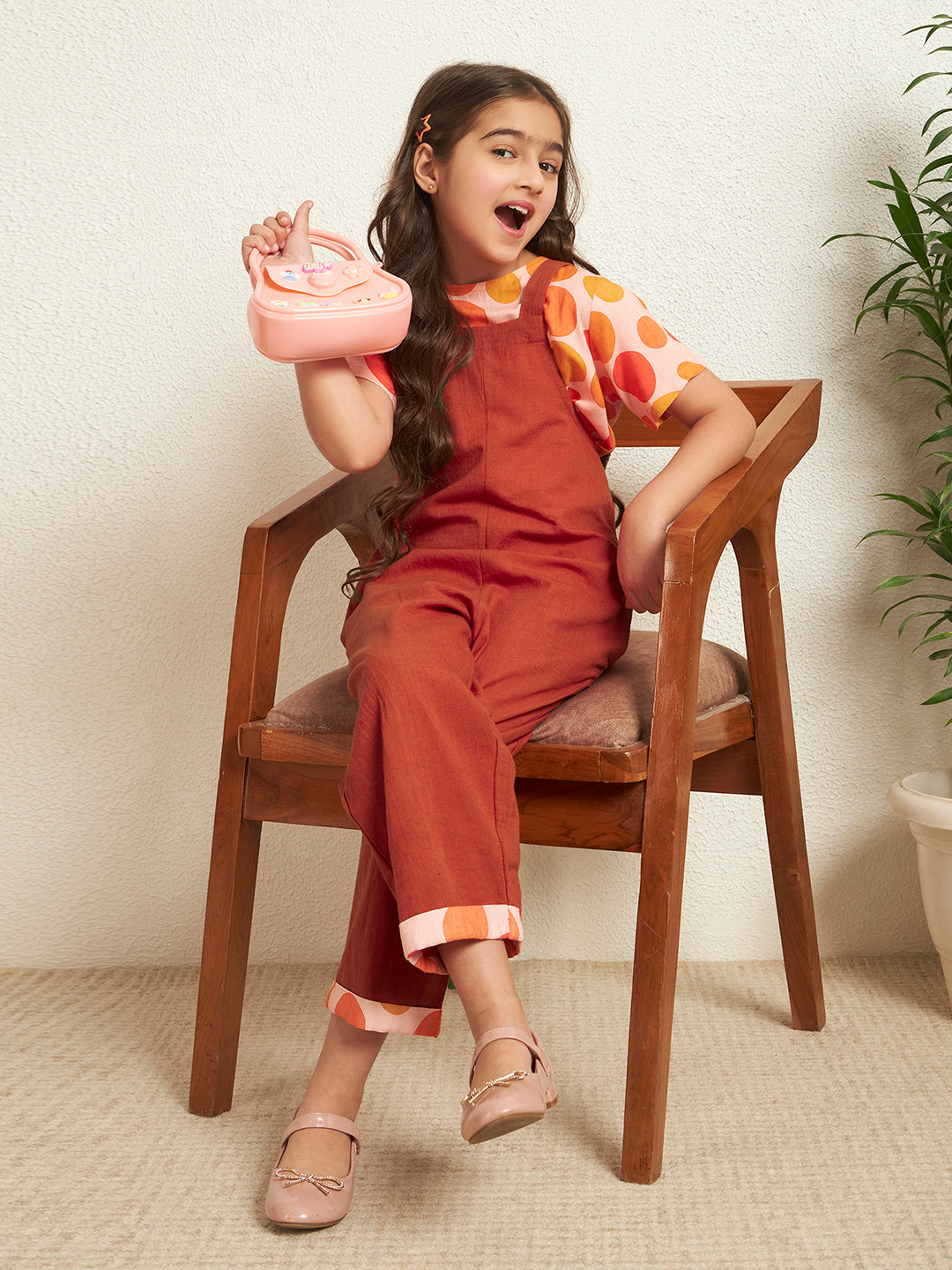 Inform when this item available Red Orange Cotton Flex Solid With Polka Print Girl's Jumpsuit Set